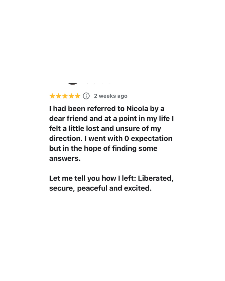 Nicola offers a SAFE and LOVING space to be HEARD and UNDERSTOOD at a deep level supporting you not just during your visit but as a mentor going forward when you need to reach out.